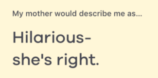 And, really, how different is ‘my mum says I’m cool’ from ‘my mum thinks I’m hilarious’. This could only be improved with the addition of ‘she’s right’ at the end. Swipe right.