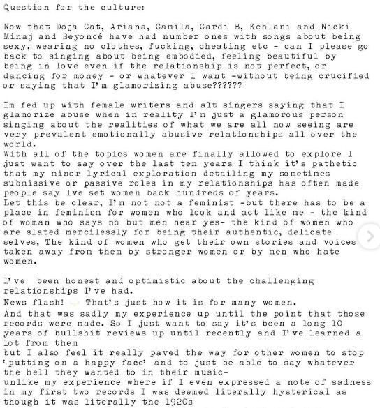 Now that Doja Cat, Ariana, Camila, Cardi B, Kehlani and Nicki Minaj and Beyoncé have had number ones with songs about being sexy, wearing no clothes, fucking, cheating, etc – can I please go back to singing about being embodied, feeling beautiful by being in love even if the relationship is not perfect, or dancing for money – or whatever i want – without being crucified or saying that I’m glamorising abuse???????