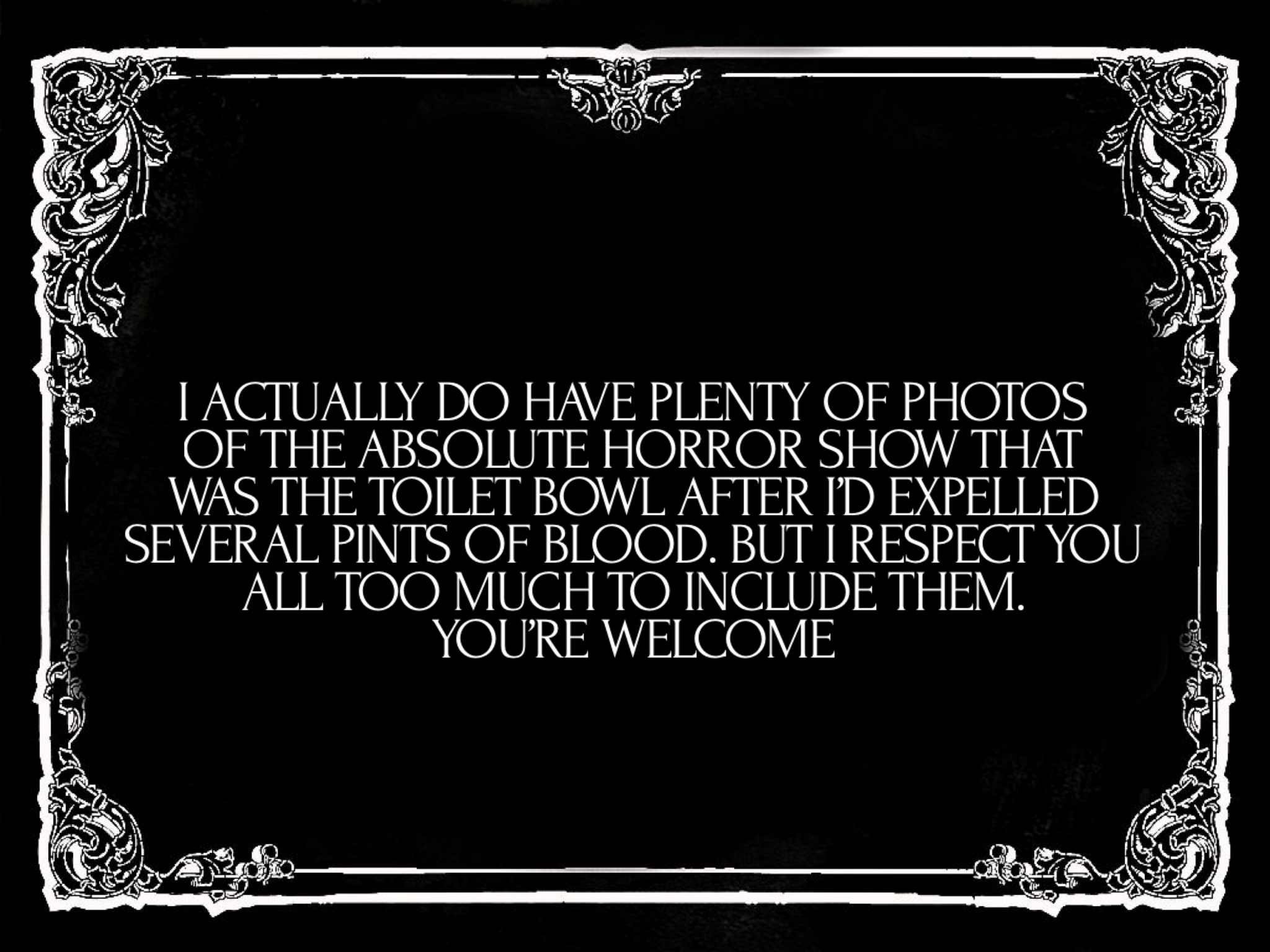 All the while, my condition was worsening rapidly. I was too hot, too cold, too everything. I was still spilling prodigious amounts of blood into the toilet, and my strength had bottomed out to the extent that I could barely walk. Every time I stood up my eyesight started to black out. I could no longer take showers, because standing up for ten minutes was completely beyond me. I was convinced that I wasn’t sleeping, simply spending the night in a horrible blackness and throbbing unknowns, constantly aware of my own fragile mortality. I would later learn that I was actually asleep much of the time, so perhaps my dreams were just cruel repetitions of my waking state. Imagine that, your dreams just being your actual reality! What’s even the point in anything? On a related note, I had a dream last week that I was watching porn. That’s it. Even my dreams won’t let me get laid these days. I was no longer sharing a bed with my wife, because seriously, who wants a part in all of this shit?? I got glimpses of living with her when sex wasn’t a factor, and it was pretty fucking grim. By this point, I was convinced that it was cancer. I couldn’t imagine how any non lethal condition could feel this bad. Plus, all that shitting blood stuff? That’s, like, canonically cancer, right? Also, in early February – in a matter of days by this point – I had a test to become a registered Immigration Advisor at Level 2 in both Immigration and Asylum. It would be the most important test I’d done in my life, one that I had stringently set up study groups to prepare for, and an exam so difficult that the last time I’d attempted it roughly two years before I had failed with a pathetic 10% grade. Fate had other plans though: I almost passed out while walking to the shower, and we called an ambulance.