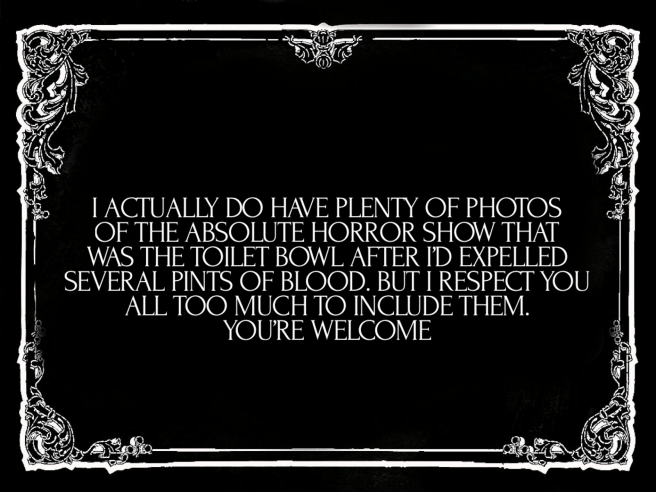 I spent about ten days in hospital. I had to rearrange my immigration law exam to the next scheduled test in May (I’d surely be better by then, right??), but still chaired a study group while lying in my hospital bed. The hospital doctors assigned me all sorts of medications to try and reverse the bodily carnage, and also suggested that one of my antidepressants, Citalopram, might be causing the bloody poos, so took me off it and instead concentrated on my other antidepressant, Mirtazapine, which had the added benefit of knocking me the fuck to sleep every time I took it. Eventually, they deigned that it wasn’t cancer, but ulcerative colitis, an inflammatory bowel disease. It had been attacking my innards so completely that the rest of my body had near enough shut down in an attempt to battle it. They prescribed me folic acid, Octasa and Omeprazole gastro-resistant tablets. Also Mesalazine, a suppository that was inserted by the middle aged Caribbean nurse while I was in hospital until it just got too awkward and I insisted that I do it myself (honestly, you might think you know exactly where your bum hole is, but it’s not as intuitive as you’d imagine). I was sent home to my wife, and broke into tears at the thought of still having to stay there. I phoned my doctor the next day and convinced them to stick Citalopram back on my prescription, as I realised I’d need all the serotonin I could get my hands on. My body was so weak that I was also prescribed a round of steroids. I never did get as jacked as I was hoping.