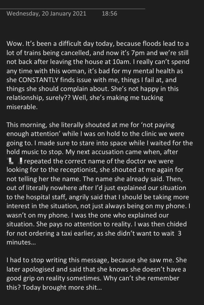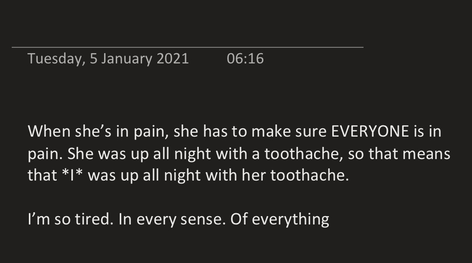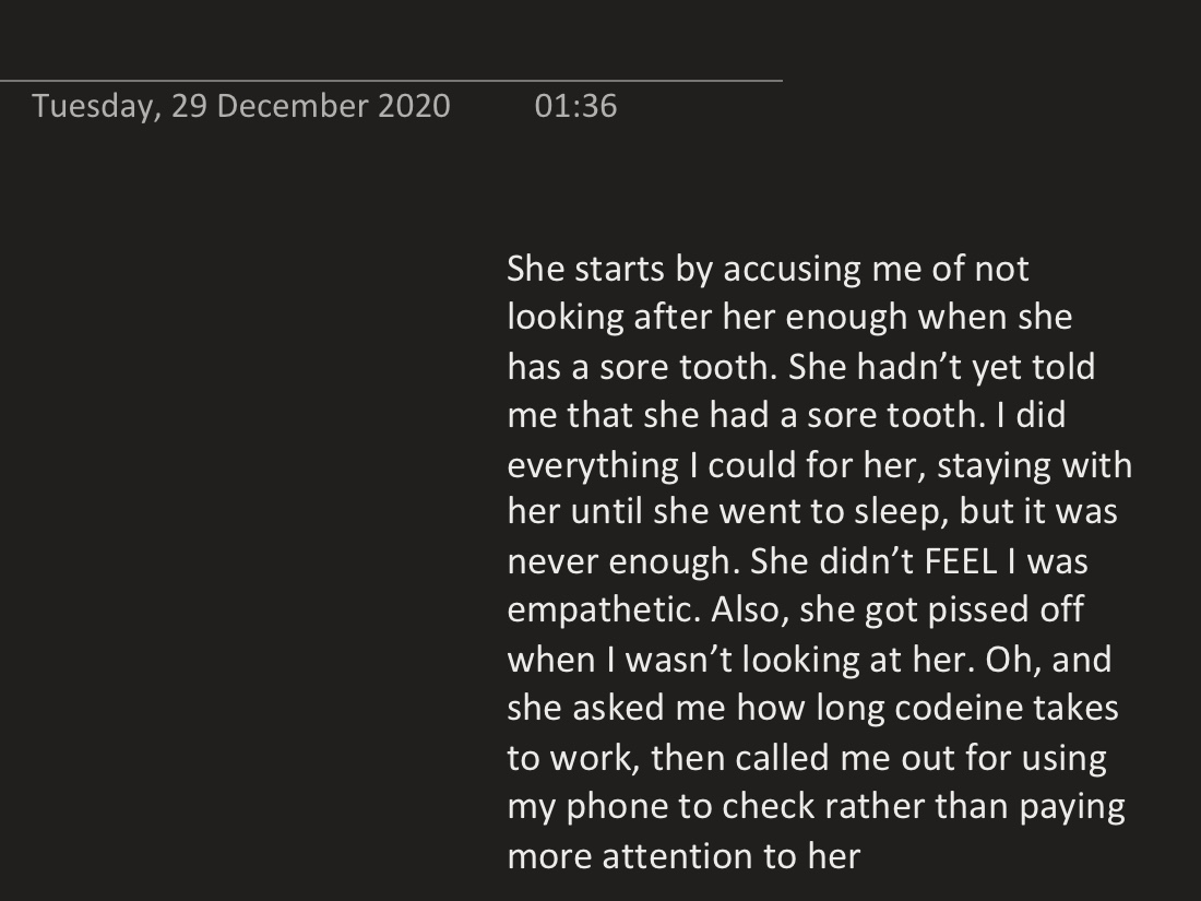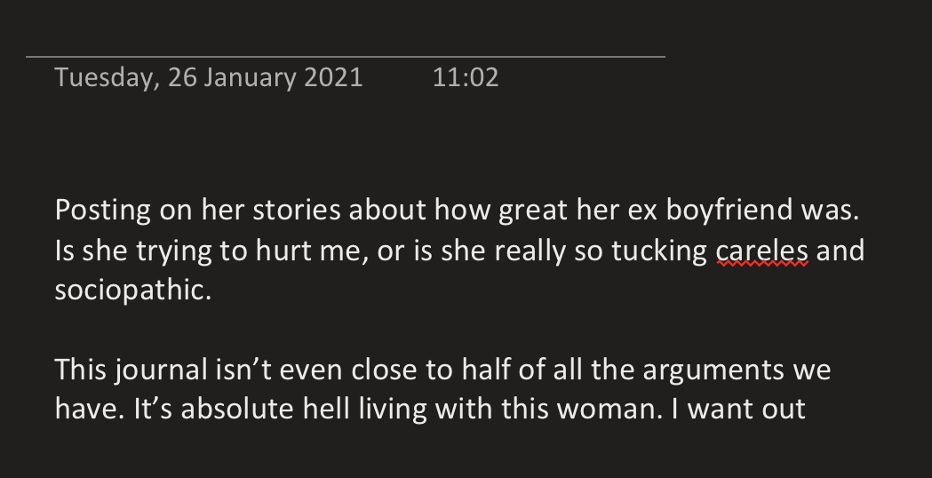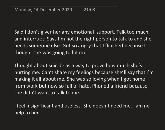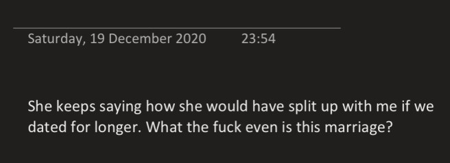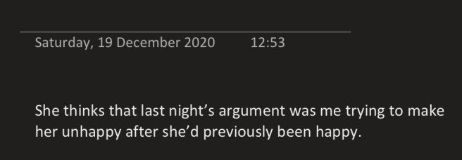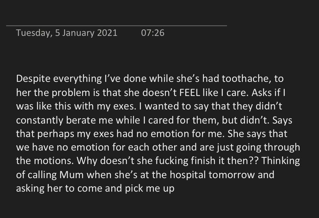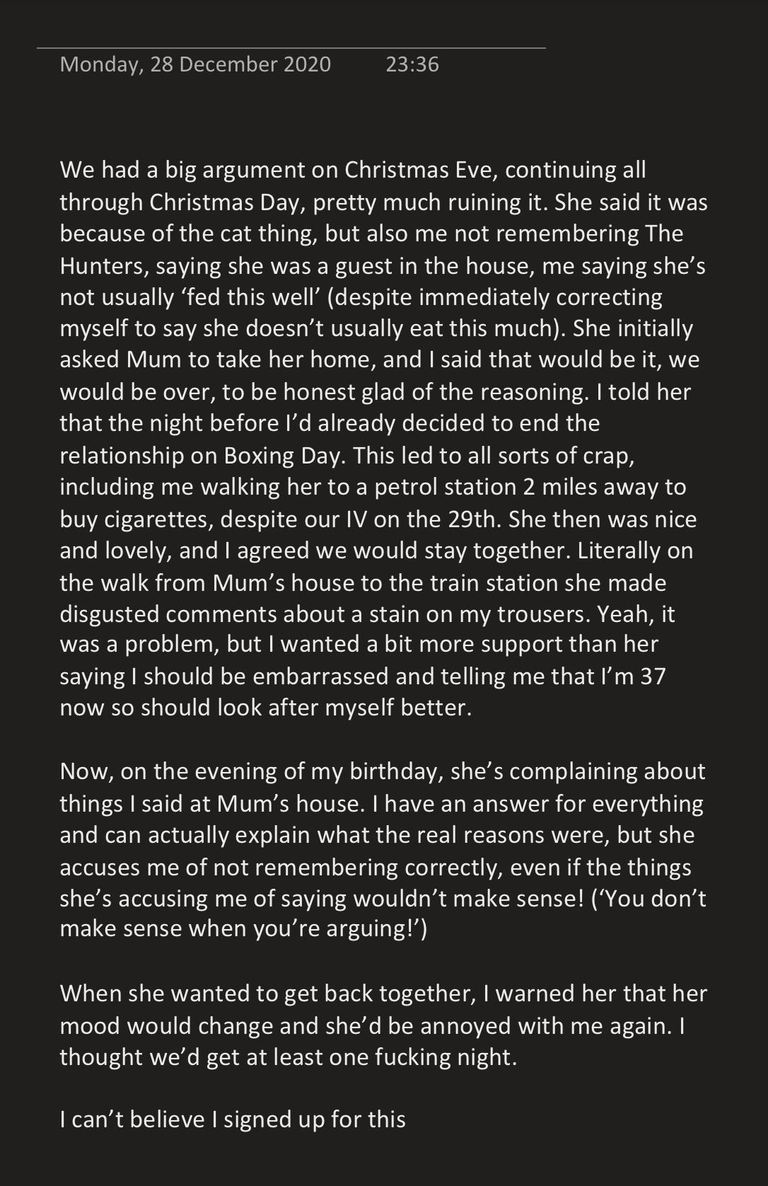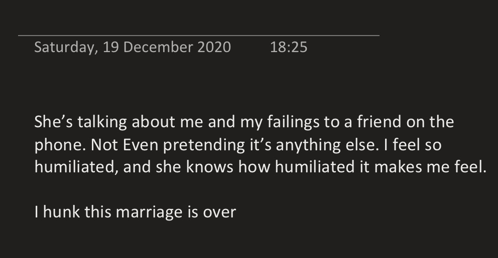 I’ve touched on how toxic and damaging my 2020/21 marriage was, and how it left my self-belief, my mental comfort and my dang desire for life in the absolute toilet. Well, this post is going to be the final reckoning, the complete and total exorcism, the slicing open of old wounds so that they can bleed completely out and not poison me again. Starting on the 14th December 2020 I started keeping a diary of how much the marriage was hurting me, it ran until abruptly stopping on the 29th January, likely because my illness became too much to leave time for such pathetically solipsistic concerns. There were thirty three entries.. I think this was in response to my wife showing disbelief that I could be feeling that way, or perhaps she had challenged me to name instances in which I was hurt and my decrepit old brain struggled to give precise details when called up on it. Whatever. I started writing them down and put them in a password and fingerprint secured OneNote file. I never showed or even mentioned them to my wife, and before recently I hadn’t looked at them myself in months. It was actually reminding myself what I said about Poppy last time around that convinced me to dig them up. I couldn’t remember the password and had to keep guessing until about three in the morning, but I got in! And here the entries are.