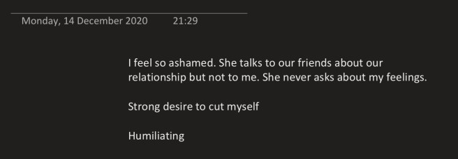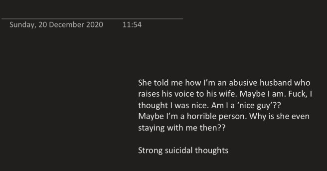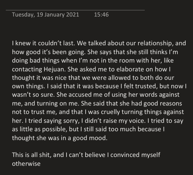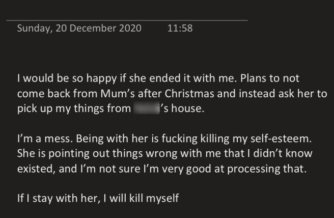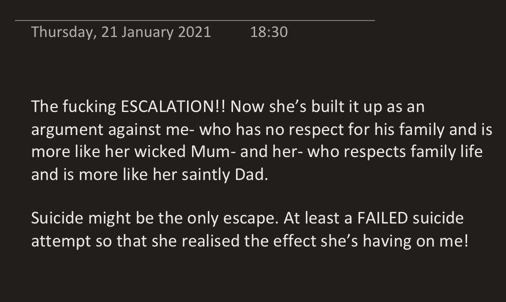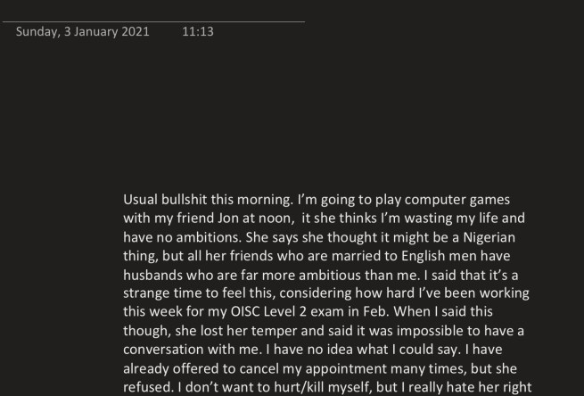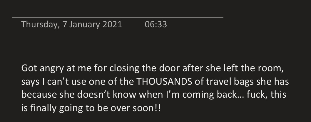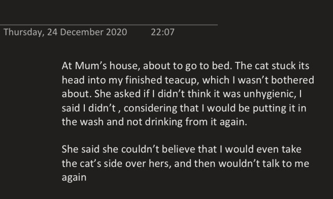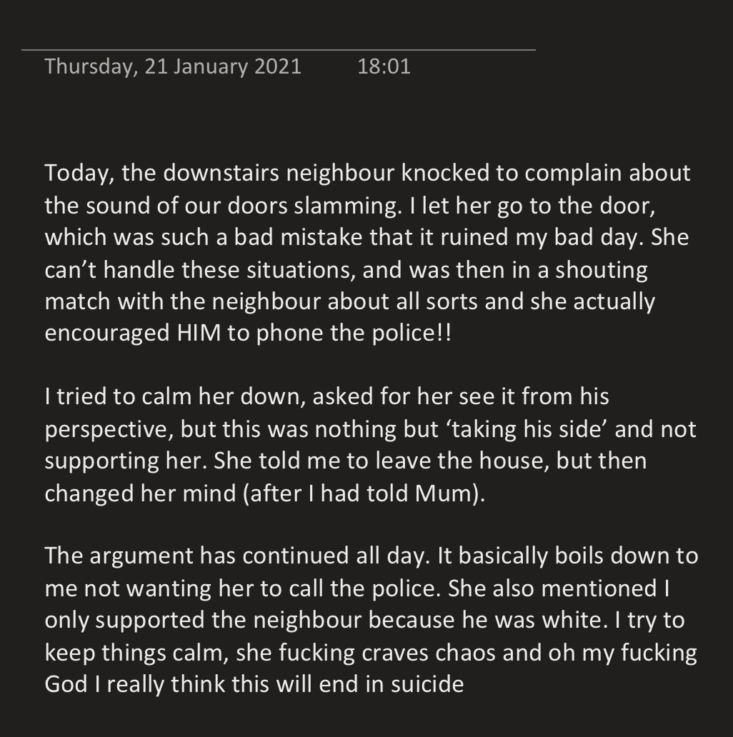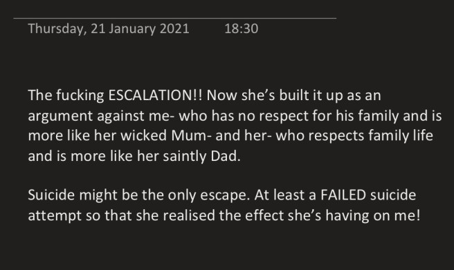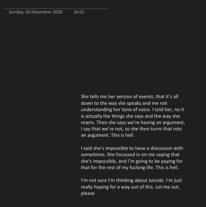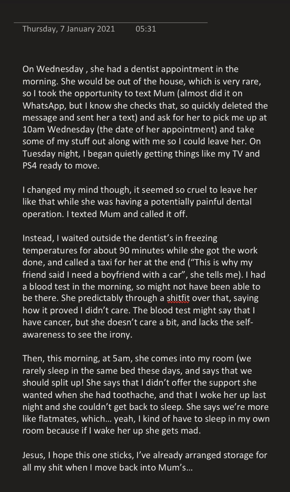 I’ve touched on how toxic and damaging my 2020/21 marriage was, and how it left my self-belief, my mental comfort and my dang desire for life in the absolute toilet. Well, this post is going to be the final reckoning, the complete and total exorcism, the slicing open of old wounds so that they can bleed completely out and not poison me again. Starting on the 14th December 2020 I started keeping a diary of how much the marriage was hurting me, it ran until abruptly stopping on the 29th January, likely because my illness became too much to leave time for such pathetically solipsistic concerns. There were thirty three entries.. I think this was in response to my wife showing disbelief that I could be feeling that way, or perhaps she had challenged me to name instances in which I was hurt and my decrepit old brain struggled to give precise details when called up on it. Whatever. I started writing them down and put them in a password and fingerprint secured OneNote file. I never showed or even mentioned them to my wife, and before recently I hadn’t looked at them myself in months. It was actually reminding myself what I said about Poppy last time around that convinced me to dig them up. I couldn’t remember the password and had to keep guessing until about three in the morning, but I got in! And here the entries are.