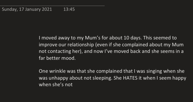 And that’s the final entry, with me looking forward to the next argument so I can voice my issues, but too much of an ‘inoffensive little shrew’ to dare to ruin her good mood. It was horrendous, and just imagine placing my soon to drop debilitating illness on top of that.