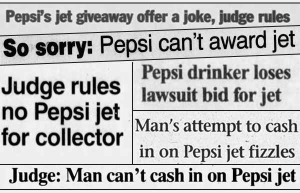 And so it went to motherfucking court! Pepsi were, seriously, not in the mood right now. “Tens of millions of Americans, and people around the world, saw the spot, got the joke, and laughed,” a PepsiCo spokesman told CBS News. “Mr. Leonard saw the spot, hired business advisers and lawyers, and decided to take legal action”. Mr. Leonard responded as even headedly as he possibly could: “I didn’t want any publicity on this. I’m not trying to make a statement. I’m not looking for a settlement. I just want a plane”. He just wants a plane, God dammit! In order to argue that the offer was meant as a joke, the Pepsi plaintiffs were required to make a legal statement as to why it was funny: