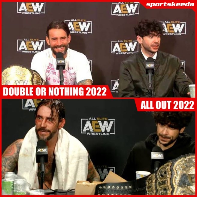 The main event of All Out saw Punk capture the AEW world title for the second time. He had only recently returned from an injury that had forced him to relinquish the title in his first reign after only eight days. At the press conference after the event, Punk sat still bloodied from his match minutes earlierm munching on cupcakes from a box and cracking opening seemingly neverending cans of sparkling water. The assembled press began to ask questions about the event, but Punk had a few things he first needed to get off his chest. Well… a lot of things. He pretty much opened by stating it was “Fucking unfortunate, that I have to come up here and speak” about his relationship with Scott Colton (Colt Cabana). But… you don’t have to at all, Punk… in fact, I imagine we’d all prefer it if you didn’t. Oh, you’re still going. Punk went into great detail about why he was no longer friends with Colt Cabana, why it was nobody’s business why he was no longer friends with Colt Cabana, and why he was no longer friends with Colt Cabana (in case you missed it the first time), why it was ridiculous that he was being questioned on why he was no longer friends with Colt Cabana, and, oh, one more thing, here’s why he’s no longer friends with Colt Cabana (“I’m very sad today that I had to get up here and say his name, he doesn’t fucking deserve it”). He was insistent that that we all recognised that Colt Cabana shared a bank account with his mother – mentioning it several times – as if he believed that one slam dunk would see him deigned automatic moral victor. It was weird, it was completely unprovoked, it was at least a little bit unhinged, and had he stopped there it would have been an unimaginably petty and bitter attack on another wrestler in the same company that, honestly, not many people have really thought about in quite some time. But he didn’t stop. We’re only just getting started ladies, gentlemen and nimbies.
