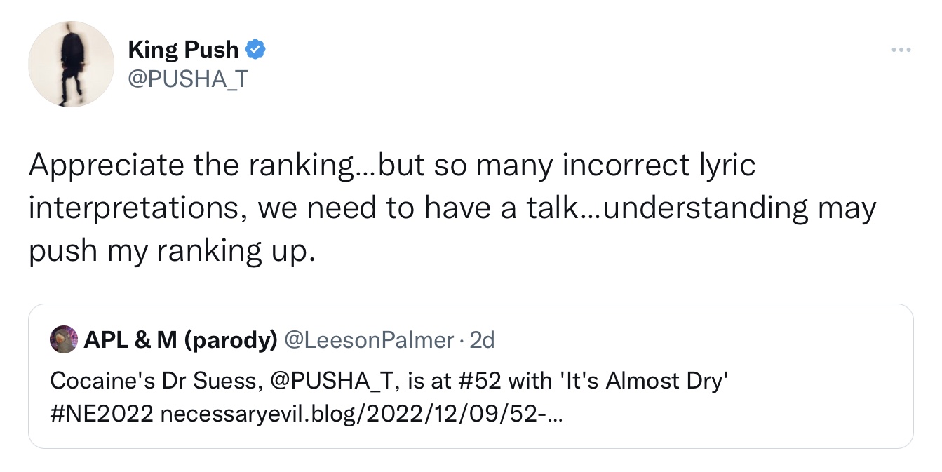 OK, if you haven’t been following the news recently, I might have to give you a quick primer. I get it, don’t worry, it can be a nasty world out there and sometimes we have to attempt to protect our own mental health by not even engaging with the horror, I completely understand if you aren’t up on possibly the biggest story of late 2022. Trigger warning, this might be the most upsetting. Remember a few days ago when I posted my Pusha T post? Fifty second best album of the year? Not bad, right? Sure not as high as the near top five placing that Rolling Stone had (bafflingly) deemed it worthy of, but then I’ve certainly been questioning if it’s actually better than Alvvays, Lykke Li, The Smile or Big|Brave, so… it all works out? I dunno, whatever, that’s where the album fell. Was it a particularly good post? Hmmmmmmnot especially. I didn’t spend anyway near the time on it that I dedicated to Tanya Tagaq or Arcade Fire, for instance, but likely because there weren’t any sexual assaults or cultural genocides to discuss. I mentioned how Pusha’s lyrics often don’t convey what he thinks they do, which I would have liked to delve into more given the time. As a post in general though, particularly when compared to my best work, it was definitely m-m-m-m-m-m-m-m-m-m-m