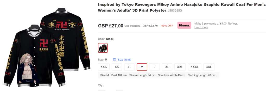 “Inspired by Tokyo Revengers”?? That seems more “inspired by the end of the thousand year reich”. I can just buy this now for £27?? What the hell is ‘Tokyo Revengers’?? Some sort of YouTube? A Nintendog?
