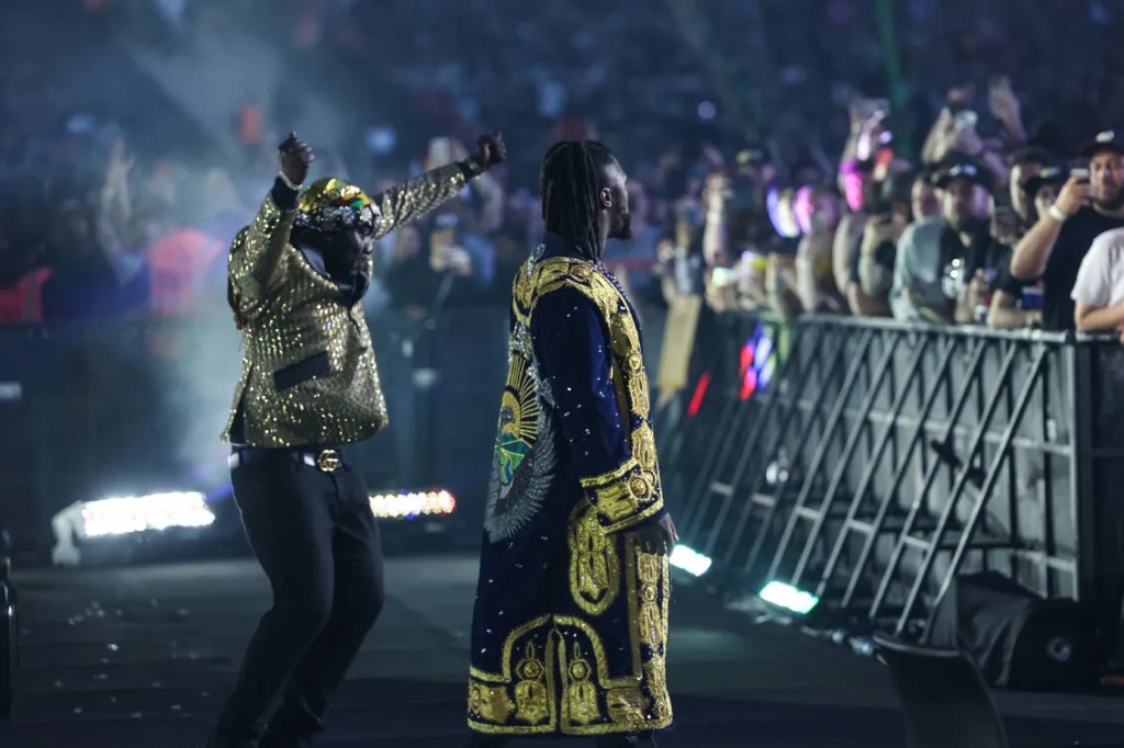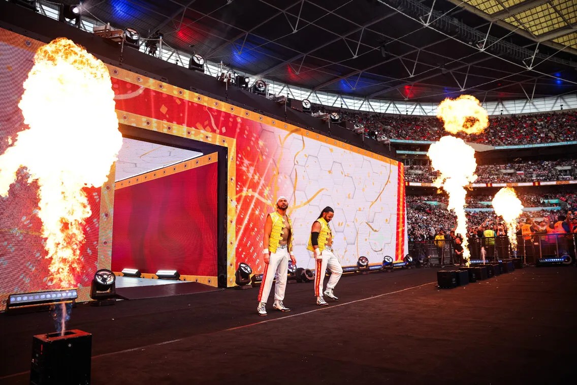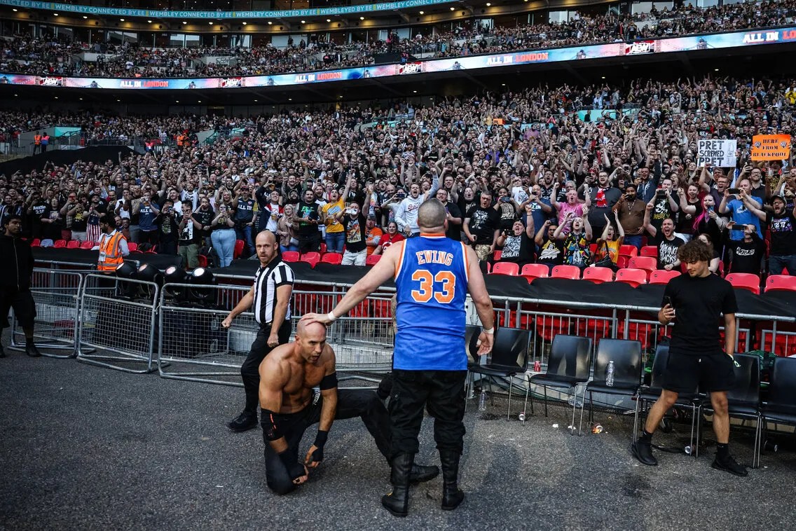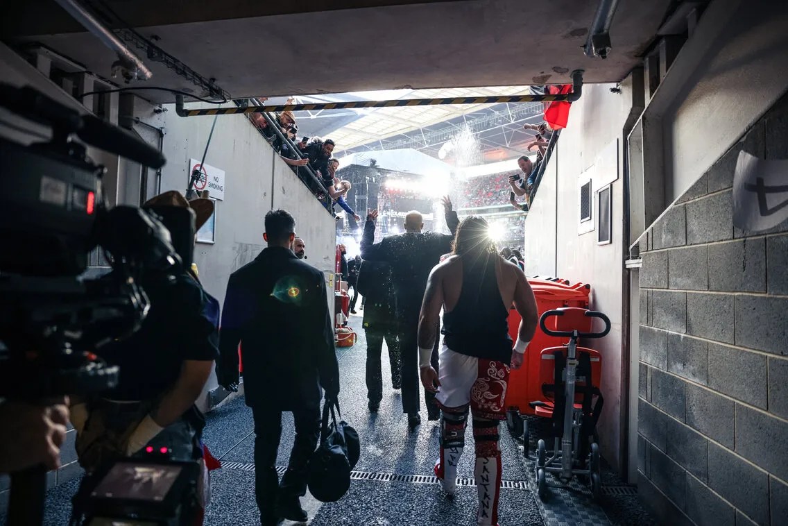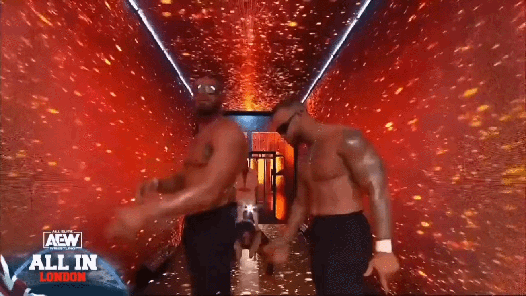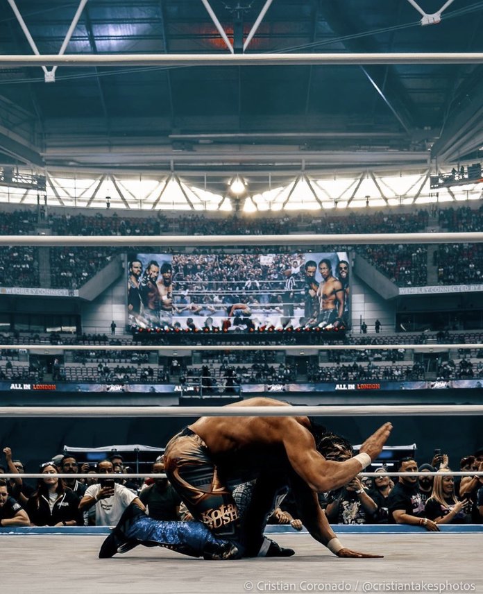 Let’s do a negativity dump real quick: the build to this match was a confusing mess. Yes, there’s of course the epic Omega v Don Callis feud. I get it. Callis sees Takeshita as his next Kenny, a younger, stronger wrestler who will earn him money for longer. This singles feud actually has a great build. But then suddenly The Bang Bang Gang (I am not calling them ‘Bullet Club Gold’ because that name is dumb as dogs cock) get involved?? Saying that they’re the real standard bearers of the old Bullet Club name (ask your parents, it was really cool thing in around 2017), not The Golden Elite. Y’know, The Golden Elite? That group that’s technically had one match in AEW? And is made up of members who have never once intonated that they give the shiniest of shits about the legacy Bullet Club? Listen, I get it, you have hundreds of TV hours to fill, and this would make a perfectly serviceable Dynamite main event, but Wembley Stadium?! Bruv?? Oh, and before we leave the negativity dump: I really wish they’d come out to Wayward son. Sorry.