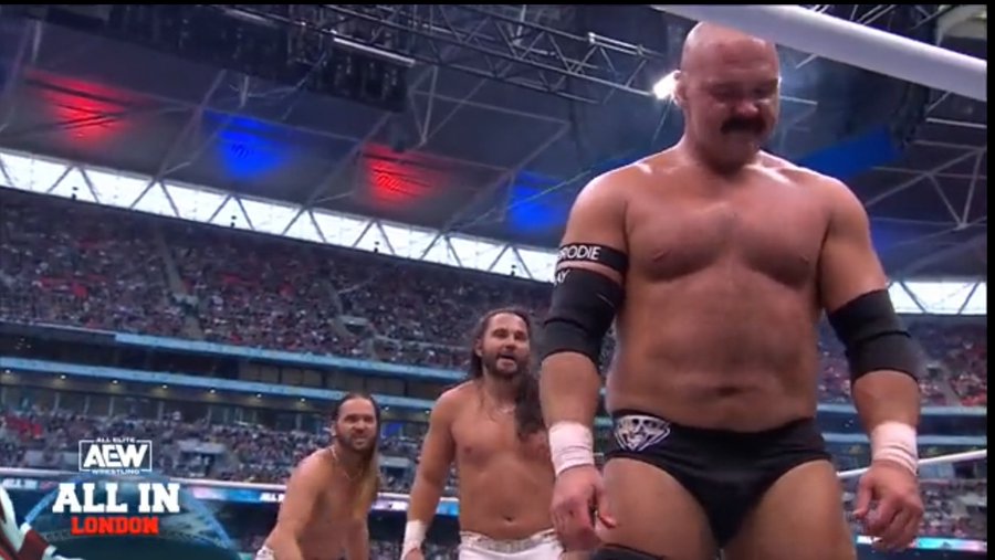 Or at least they love popping for the entrance, cheering the rap and chanting “Oooooooooooh , scissor me daddy” (really guys? Seven Nation Army again?). The actual match itself they don’t really care about. This was a tired, heatless match, ending with what I’d argue was a poor decision taking the titles off House of Black (who I hear are a far more over act with crowds at wrestling events) to put them on The Acclaimed for a cheap pop for Billy Gunn, who is apparently a wrestling legend on par with Terry Funk. Oh, and also to allow AEW’s merchandise machines The Acclaimed to roll out some more tat. It’s a shit business. At All In, Gunn was given the biggest spotlight in ring, whereupon he loudly extolled Julia Hart to ‘suck his cock’, before knocking her down before Anthony Bowens dropped a leg, in the words of Taz, “Right in the yambags” (that’s an American word meaning ‘minge’). So weird. What even was this?