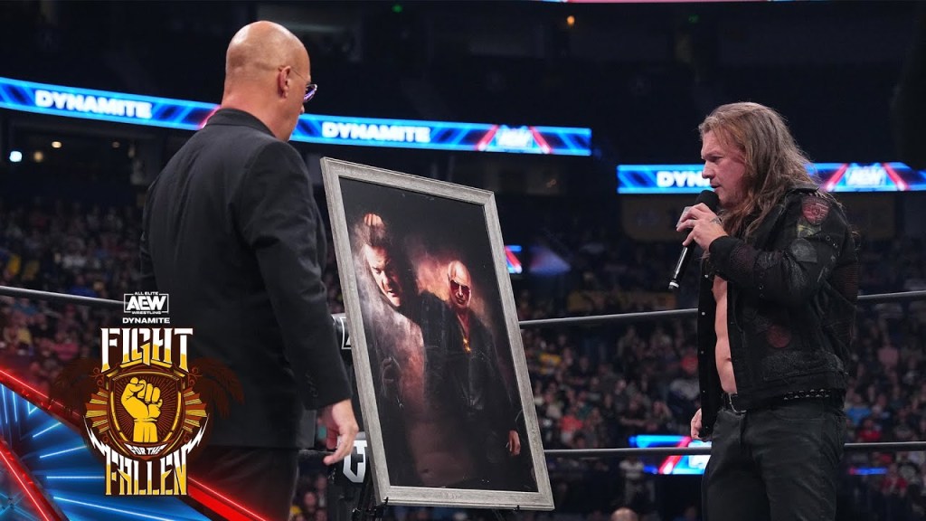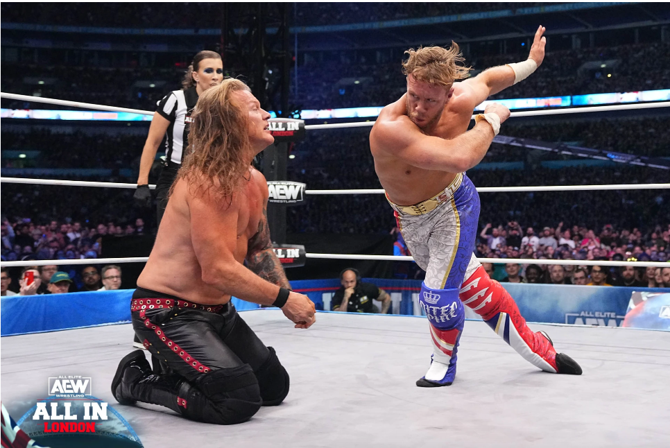 Some quick build up moans, of which is now traditional: this also all started – obviously – with the epic Kenny Omega v Don Callis feud. This was the hottest feud in AEW, with Callis generating heat that it’s difficult to find comparable to in the company’s short history. Jericho, being fucking Jericho, thought to himself “I gotta get me some of that”. In story, Callis inexplicably next turned to Jericho, trying to convince him to join the Don Callis Family. Jericho seriously considered it, causing the break-up of his own group – The Jericho Appreciation Society* – as he considered ditching the lot of them for a quick personal gain. Finally, the moment came, and Jericho… accepted the offer, making it known how much he wished to join the heel faction. After hugging to celebrate the deal happening, Jericho asked what the painting was that Callis had brought on stage for the occasion (I swear to God, wrestling is so fucking dumb). Callis obviously didn’t want him to see it, but Jericho managed to reveal… a painting of Don Callis holding the disembodied head of Chris Jericho. Because, you see, Don Callis actually thought he would say no. So made a Spite Painting. The whole thing was… a trap…? To get Jericho to face his other client: Will ‘Maybe Best Wrestler in the World at the Moment But Also Absolutely Problematic, Bruv’ Osprey. Because Osprey hates Jericho calling himself the ‘GOAT’, or summink. I dunno. So because he’s kinda facing Don Callis, Jericho would be the face. After dumping all his friends to join Callis’s heel group. It is, to put it lightly, a clusterfuck.