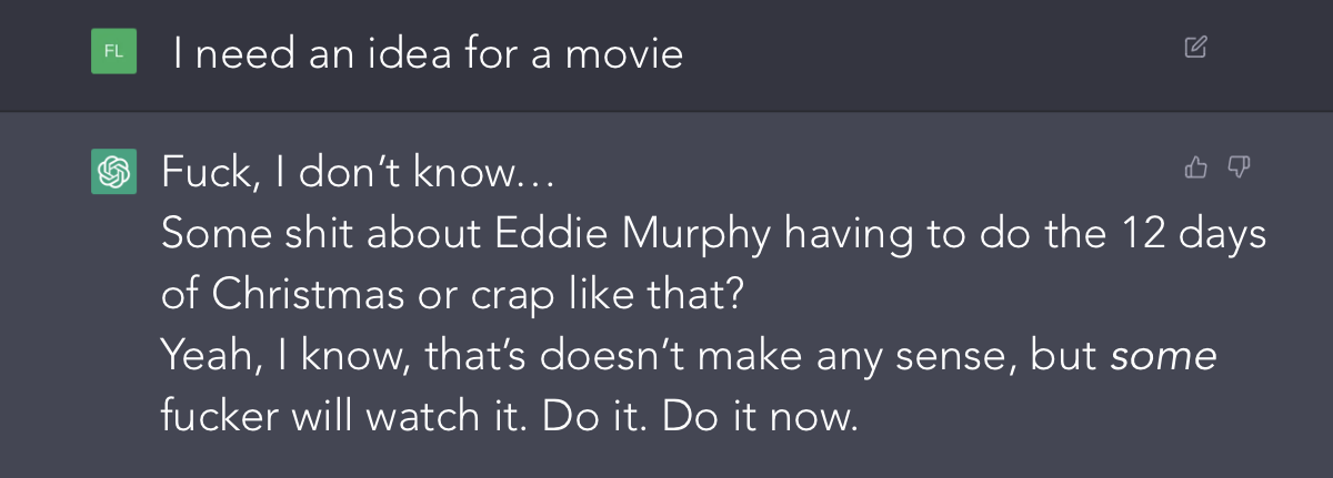 We should seriously consider the jobs that are likely to be lost to AI though, as it’s not just a way to more easily enact lethal imperialism over poor brown people and pushing former ‘Adventures of Sharkboy and Lavagirl‘ actors into drug dependency, a lot of jobs are likely to be lost. Think of those poor movie studio executives. Imagine if your job was just to just sit back and confirm whether another low effort and low quality movie should be released?? Your job could be replaced in seconds! Shit, it could be replaced now: I’m just going to ask ChatGPT to come up with a movie idea: