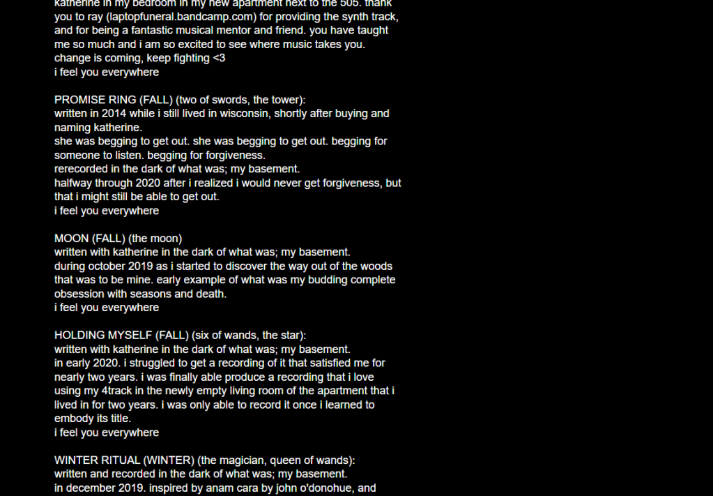 NOTHING! Motherfucker didn’t say shit! I know you were one of those ten losers who read the message, so at least tell me to fuck off! I’m only asking that you at least add descriptions of the songs to your Bandcamp or something, give us freaks something to go o…