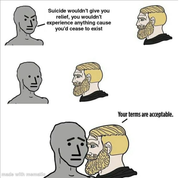 The perverse, unhealthy euphoria of suicide. The chance to escape the gross and suffocating limitations of the human body. Bodies that you’ve spent so long twisting into yourself they have become misshaped and concave. Man, this spiritual plane sucks!