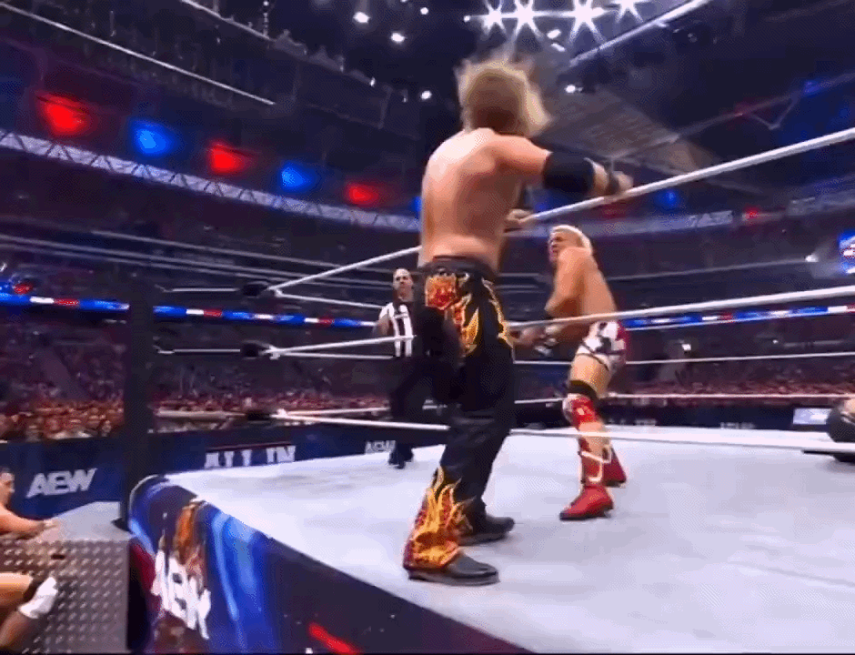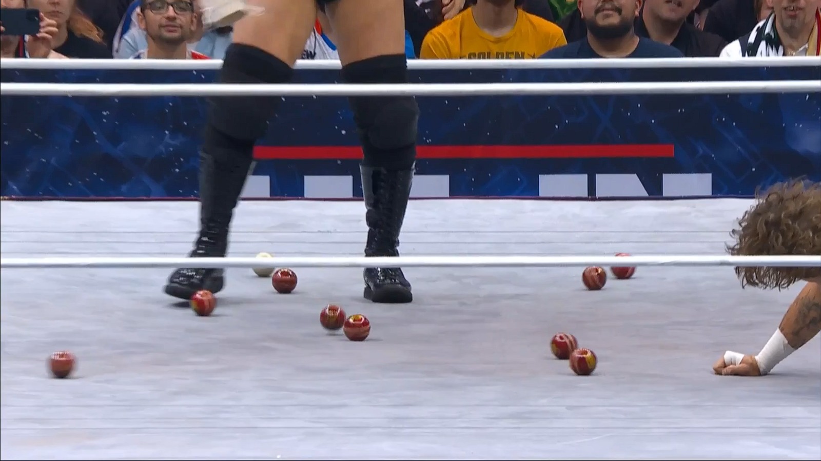 Yeah, they did not think those streamers through, did they? Thankfully they never actually interfered with any match despite hanging over the ring for the rest of the night (and poor minimum wage stadium crew constantly scurrying round the sides attempting to take them down), but oh my God my anxiety for the rest of the night! I would spend the next couple of hours picturing Bryan Danielson attempting a backflip off the turnbuckle and getting his neck caught in the streamers, slowly hanged to his death in front of a live audience as the crew could just watch on. Yeah, sure, they could just send BIG BILL down there to pluck the streamers off (guy’s seven foot tall, which I hear in unteachable), but he’d never get there in time, the rampway is huge! No, we’re all now watching a live snuff film, thanks a lot, America.