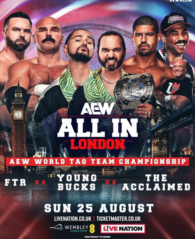 Now, the Bucks have turned fully heel in a completely inane storyline where they’re revealed as being behind the scenes pulling the strings in AEW sometimes. Yo, Jacksons, pretty difficult title match you’ve given yourself here, why not just book yourself in a match against Jedward? Oh, sorry, I forgot your role as EVPs only extends to changing the Dynamite intro sometimes and picking a world title opponent once. Gotcha. FTR are FTR are FTR are Bret! Bret! Hart Foundation! ‘Spect the business! are FTR are FTR, and they just seem a bit lost and inconsequential now. They had as good a 2022 as any wrestlers have had a year ever – peaking with one of the greatest wrestling trilogies ever against the Briscoes – but have just seemed to lack direction since. The Acclaimed are an even stranger proposition: they have been possibly the most popular group in AEW history, but they’re act has been growing very stale rover the past year or two. They might be turning heel, but absolutely not tonight when fifty thousand people in London get the chance to sing ‘Scissor me Daddy’.