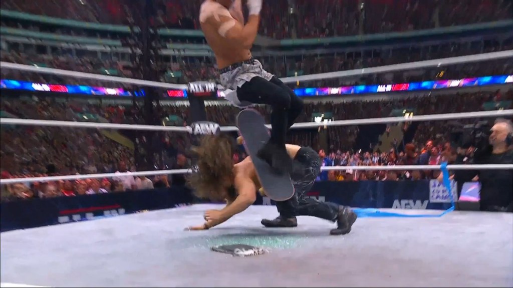 When Hangman Adam Page – who’s new gimmick is basically a divorced Dad who recently got reading about QAnon and is pissed – entered the match, the sense of dread that engulfed the arena was palpable. His heel work since being driven insane by Swerve Strickland’s unpunished crimes against his person has been so good that fifty thousand fans – a good 40-50% of whom are pretty sure that wrestling is fake – all thought “Oh no. He’s going to do something awful…”. There was an early sequence between Hangman and Cassidy that, once again, made me come. Hangman was the clear favourite, given that a win would pit him against the champion Swerve and allow the heated feud to get another chapter. But nobody had considered a Jeff Jarrett guitar shot, which is actually the most devastating move in wrestling. Hey, Americans, remember when I said that being hit by a cricket ball was worse than a school shooting? Well, a Jeff Jarrett guitar shot is worse than 9/11.