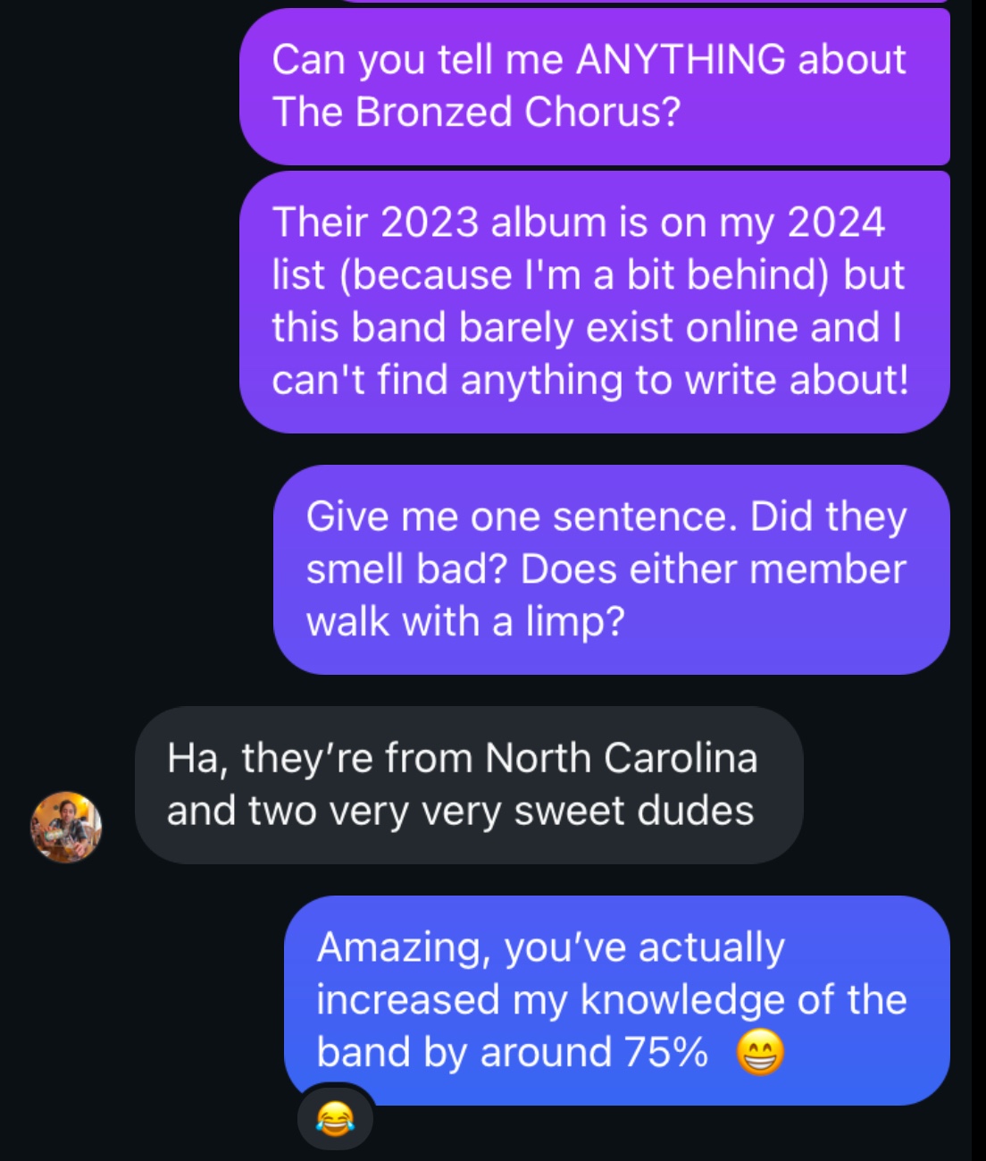 But The Bronzed Chorus, man, they made a 2023 album so good that it’s the scientifically proven, objective thirtieth best album of 2024. That’s quite a flex.
