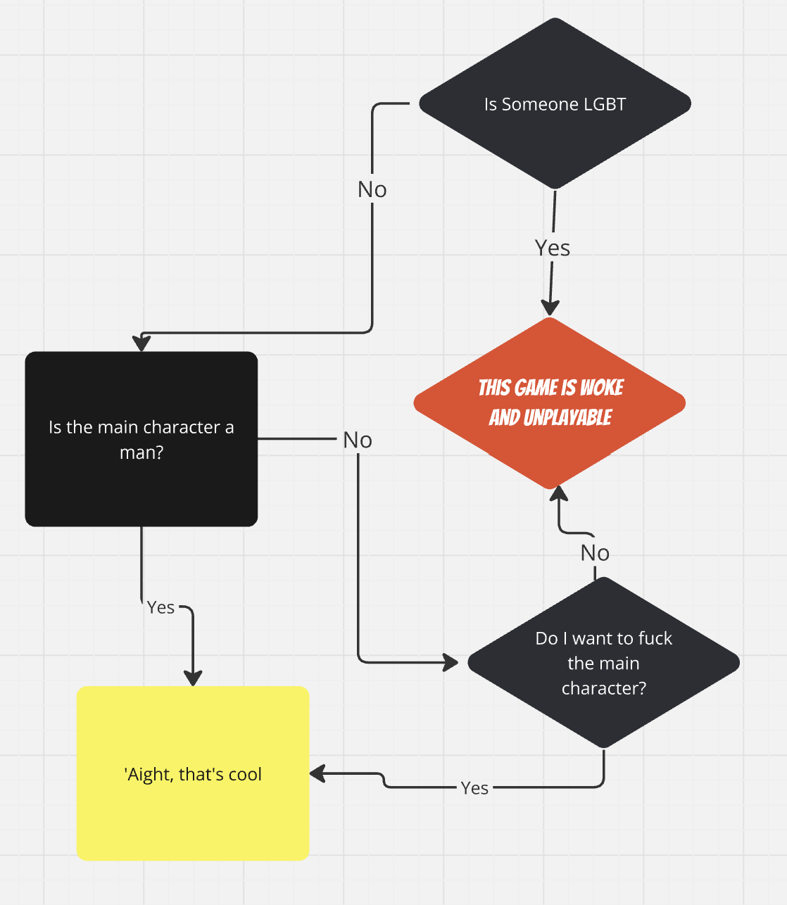 In the real world, such intrusive thoughts would never be broadcast, as the person would know that everyone else at the table would quite rightly shame them into silence, likely never talking to them again. But what if this person has no shame? What if they kept on cooking? What if they were buoyed by this lack of shame to start talking about how female characters in games aren’t as easy to wank to these day? What if they said, out loud, “For the past 13 years, the video game industry has been under assault by woke interlopers and ideologues… In their wake, the video game industry was forever changed to reflect the sensibilities of the mentally ill, feminists, homosexuals, queers, wokesters, and other perverts”? Everyone would say, sorry mate, what the fuck are you talking about again? And they’d say “Oh, sorry, I was talking about the defeminisation and uglification of women in video games“. Of course, you’re still really confused by what they mean, as you’d previously quite happily played Psychonauts 2 (“Your boss is a Woman of Colour whose backstory is she was treated unfairly by a white guy. Woke! I’m not racist, I called her a ‘woman of colour’. Not ‘jiggaboo'”) without ever feeling the need to whip your dick out and furiously choke it to Razputin Aquato. This person asks you to sign their petition to make the outfits in Stellar Blade more skimpy. Wait, so mate, this is, like, the most important thing in the world for you?? This is what you’re dedicating all of your time and energy towards?? The person doesn’t hear you, they’re too busy presenting their flow chart of what makes a video game playable: