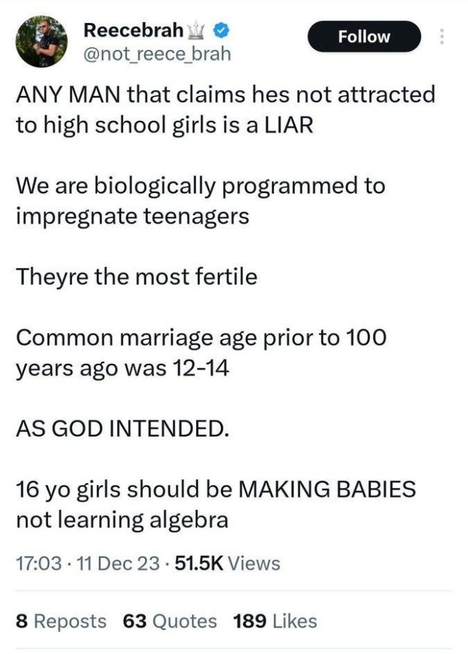Remember when you met people in person? Remember when there was a place to go that wasn’t home or work? Remember what it was like when you had, like, four people together, talking face to face? Imagine if one of the people you were with looked you dead in the eye, did not even blink as they took one last sip from their pint, and then loudly and proudly that they believed that all men should want to impregnate 12-14 year old girls because that’s when they’re most fertile. That just wouldn’t happen. Every person would be too ashamed to air these horrendous intrusive thoughts in public, even among friends. And yet @not_reece_brah is confident airing these insane perversions to more than fifty thousand people. Plus it’s on this blog now, so you can add another six or seven people to that.