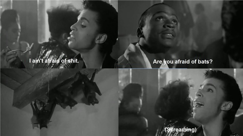 That classic ‘Wrecka Stow’ scene isn’t Christopher/Prince just making funny words, as Mary Sharon actually suspects, but Him demonstrating how far removed the woman is from the streets of the real (black) world that Him and Tricky come from. He even makes a joke about how Kristin’s character might “get black” during sex: meaning becoming less inhibited, less concerned about her prim self awareness. And that bat scene, of course, references how… black people are scared of bats…? Like I said, it’s not entirely successful.