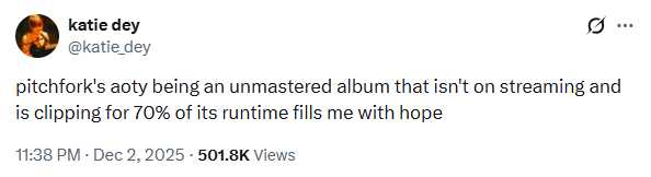 An utterly unique record that’s absolutely the one record released in 2025 that seems to be forwarding the idea of a completely new way of composing music. Remember how a millisecond scratch of music sounds when you’re on Cake? That’s what this is. So, I dunno, Chris Morris was doing that in the late 90s, so maybe he deserves the credit?