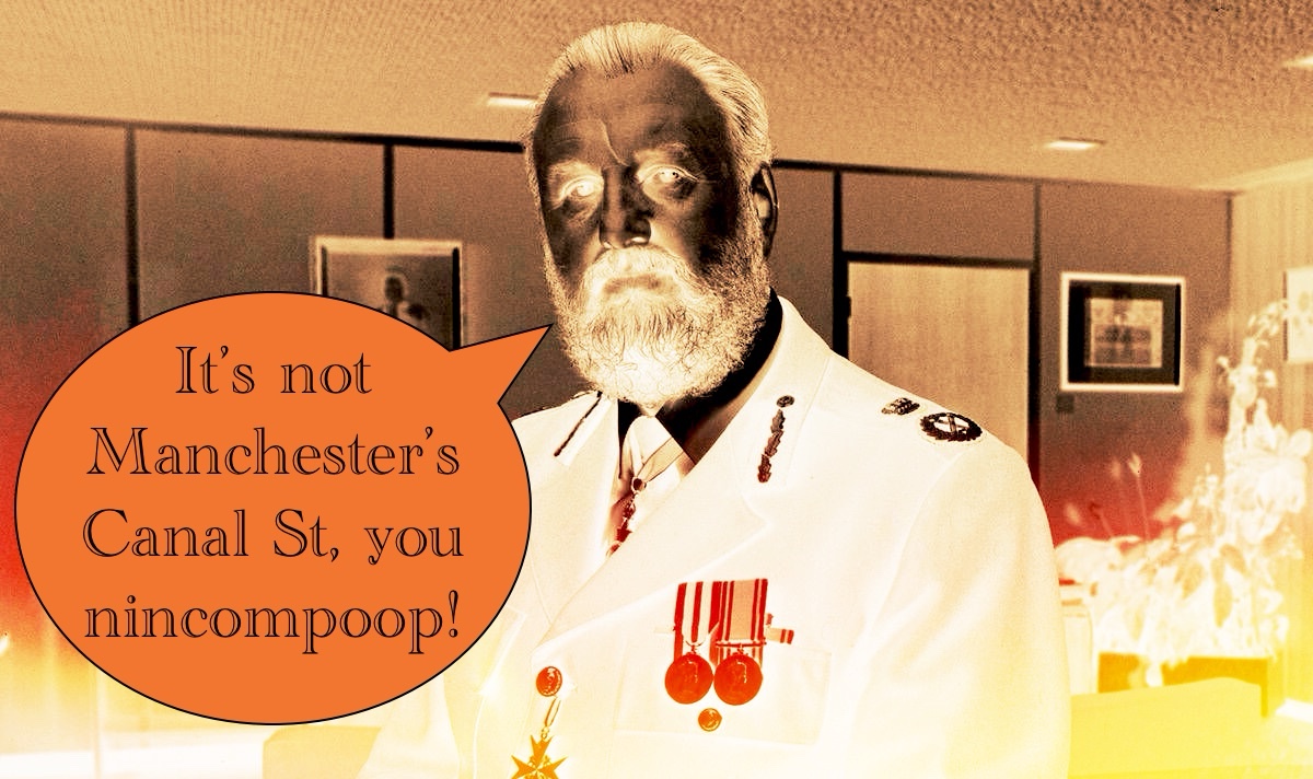 In the early 19th Century, Manchester became known as ‘Cottonopolis’, as the factories in the city would produce 30% of all the world’s cotton. Cotton that was… yeah… picked by slaves in the British colonies… But then Britain outlawed slavery! Yay us! So Manchester… just imported from American slaves until their pesky Civil War put an end to that… Anyway: Stone Roses! Happy Mondays! Mad fer it mad fer it mad fer it! In Manchester, when times were good and the blood soaked cotton was produced by the hands of the indentured Working Class, Manchester’s vast canal system would transport all of Capitalism’s illicit winnings across the city. Canal Street, as the name might possibly perhaps maybe suggest, was a bustling street alongside one of these canals. However, America’s abolition of slavery was terrible for business, and by the later 19th century areas like Canal Street became abandoned from lack of trade. The vacuum, as it often does, attracted a lot of attention from people who’d prefer to conduct their business away from prying eyes, which considering what was illegal at the time meant – to use the scientific term – the gays and the prossies. By the middle of the 20th century, the area was essentially a full blown red light district. Even after 1967’s legalisation of homosexuality as long as them poofters kept it to themselves, the police would always play very close attention to the goings on in Canal Street, often busting bars and arresting people under the ‘Licentious Dancing’ law, which prevented two men or two women dancing together. As the AIDS crisis of the 1980s erupted, Greater Manchester Chief Constable Sir (!)James Anderton (who was, I might add, a colossal cunt, but thankfully he’s dead) justified his overzealous policing of Canal Street by saying “Western civilised society is being hastened and facilitated, in my opinion, by our increasingly degenerate conduct as a human race. I see more and more evidence of increasing numbers of people swirling around in a human cesspit of their own makin“. So that was nice.